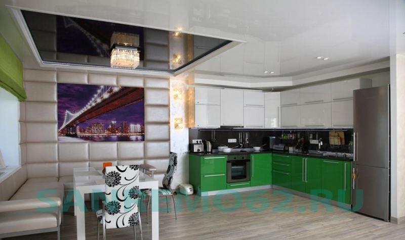 Кухня — это помещение, в котором много готовят, а следовательно, постоянно есть задымленность, жировой налет и влажность. Натяжные потолки из ПВХ прекрасно моются и способны сохранять свою привлекательность долгое время.